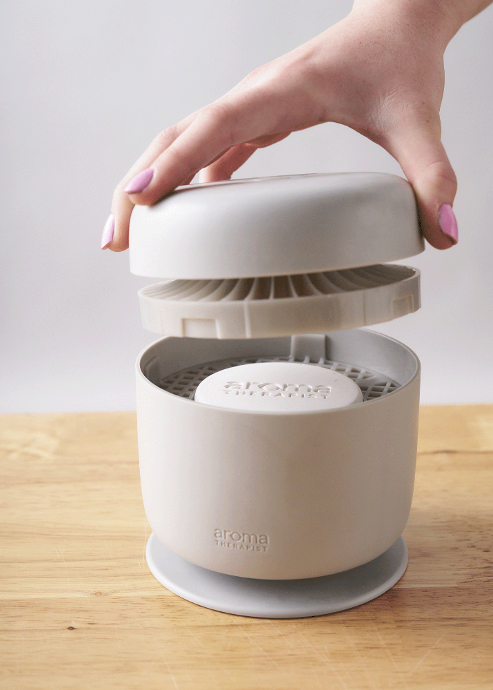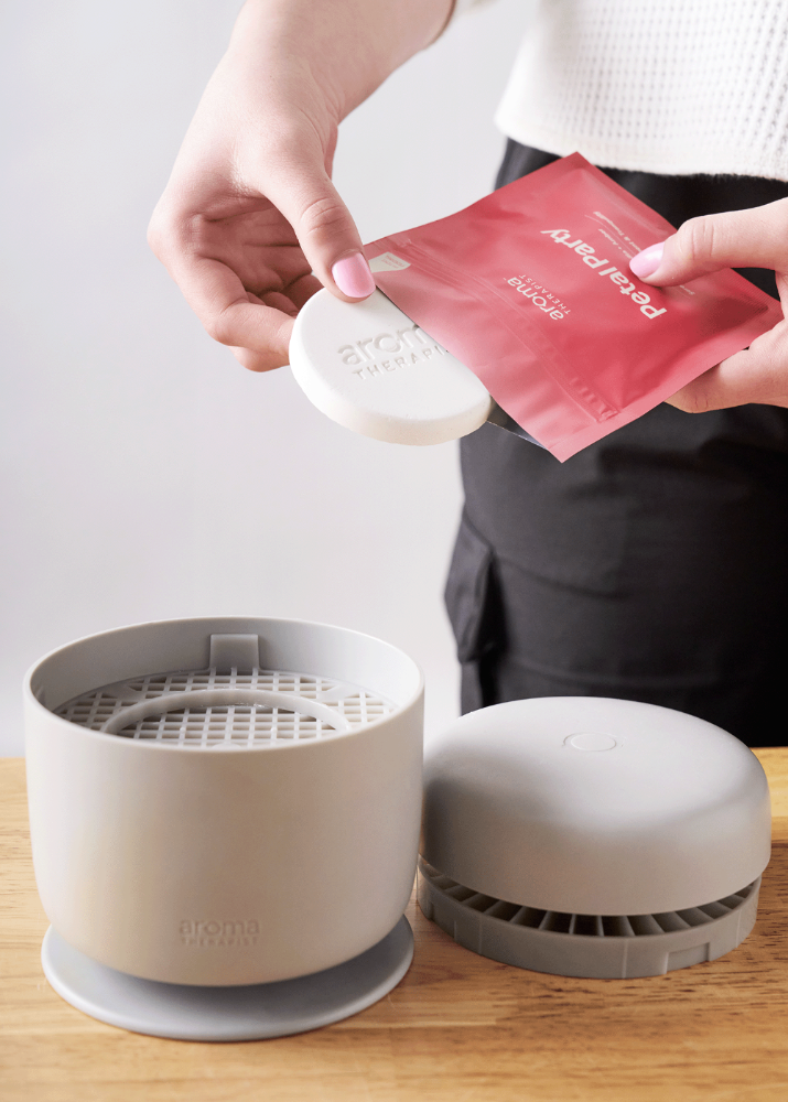 AromaPucks are pre-scented with fragrances curated to bring calm to the chaos. No water, oily residue, wax, or smoke, just weightless bliss.